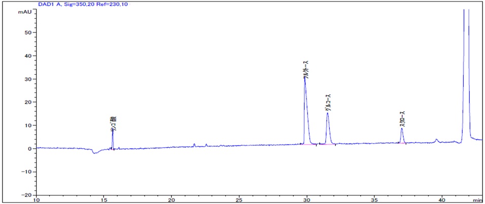 リンゴジュース、オレンジジュースの両方にリンゴ酸が、オレンジジュース中には酸っぱさの元になるクエン酸を確認することができました。どちらも蒸留水で希釈調製するだけで分析を行なうことができました。