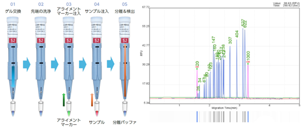 専用のキャピラリー電気泳動カートリッジを使用し、手技の簡略化と人為的誤差を抑え、高分解能で泳動~検出~洗浄を自動化して、連続解析を可能にします。泳動結果は、シグナルデータとゲルビュー(グラフの下部)としてリアルタイムに表示されます。