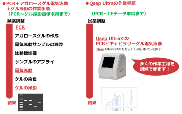 ●PCR+アガロースゲル電気泳動と比較して、作業負担と時間を大幅に削減し、人為的誤差を排除